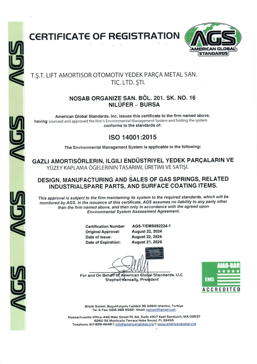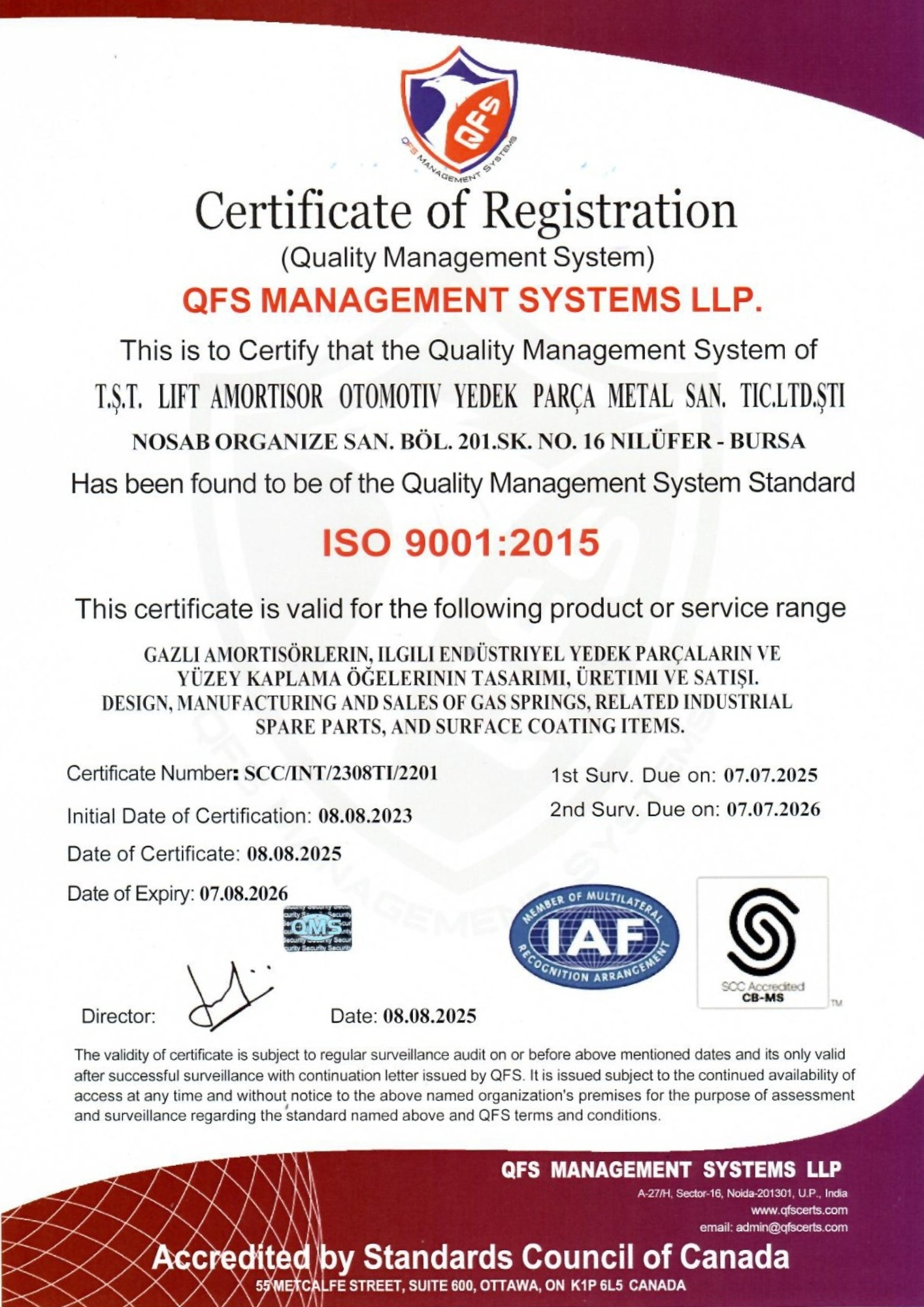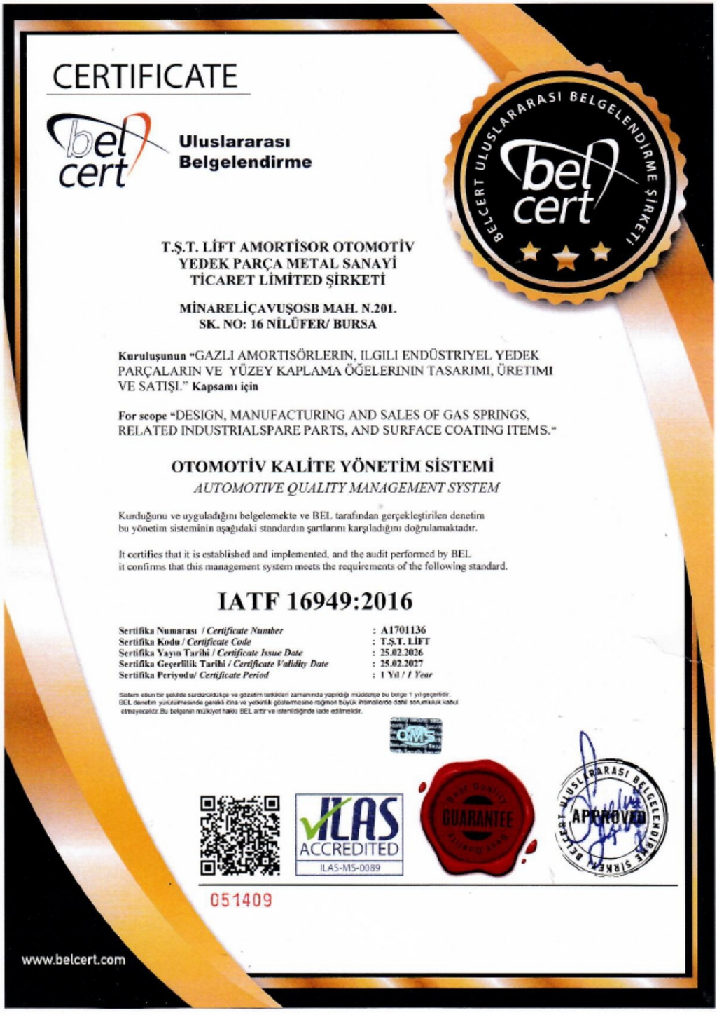 Tescilli Kalite StandartıBu sertifika, T.Ş.T. LİFT AMORTİSÖR’ün küresel otomotiv endüstrisi tedarik zincirinde en üst düzey kalite gerekliliklerini karşıladığının en güçlü kanıtıdır.